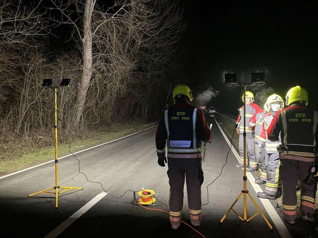 Nakon konzultacija s voditeljem intervencije, naši su članovi pružali pomoć u spašavanju dvije unesrećene osobe koje su bile zarobljene u vozilu. Osiguravajući svjetlosnu rasvjetu, pomoć pri izvlačenju te probijanju do ozlijeđenih osoba.